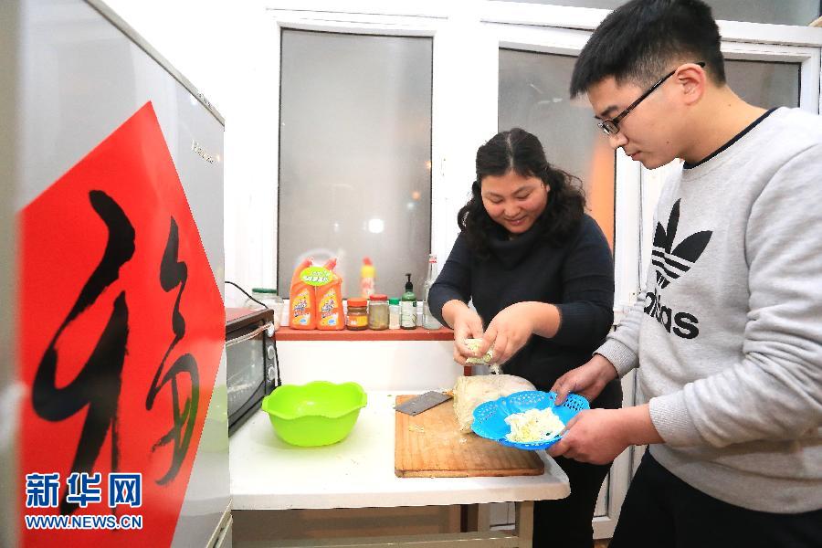 2月10日,农民工万文超(右)、马慧敏夫妇在“夫妻房”里一起做早餐。春节前夕,山东大型纺织服装企业即墨市即发集团为农民工建设的400余套微型“夫妻房”迎来职工入住。该企业建设的微型“夫妻房”面积从20平方米至40平方米不等,卧室、卫生间、厨房、暖气等一应俱全,公司按照业绩排名分配给双职工,免费供他们使用,这不仅减轻了农民工夫妻的租房负担,还让他们有了家的温暖。新华社发(梁孝鹏 摄)