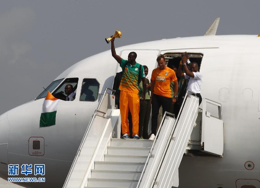 2月9日,在科特迪瓦城市阿比让机场,科特迪瓦国家队队长亚亚图雷(前左)手持非洲杯冠军奖杯走出机舱。科特迪瓦队2月8日在赤道几内亚巴塔进行的非洲杯足球赛决赛中经过点球大战,以9比8战胜加纳队,历史上第二次夺得非洲杯冠军。新华社发(伊万·索恩摄)