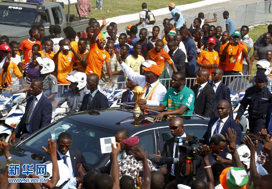 2月9日,在科特迪瓦城市阿比让,科特迪瓦国家队队长亚亚图雷(中右)和科特迪瓦总统瓦塔拉(中左)手持非洲杯冠军奖杯向夹道欢迎的当地群众致意。科特迪瓦队2月8日在赤道几内亚巴塔进行的非洲杯足球赛决赛中经过点球大战,以9比8战胜加纳队,历史上第二次夺得非洲杯冠军。新华社发(伊万·索恩摄)