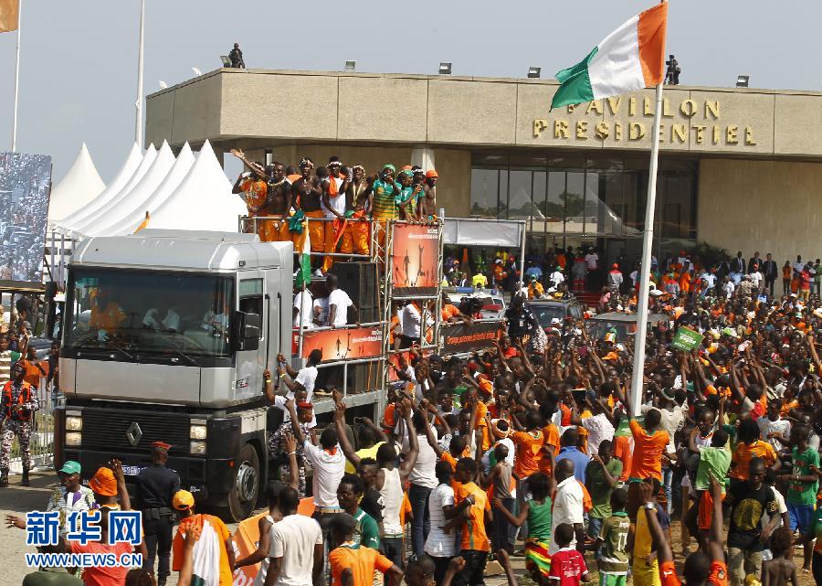 2月9日,在科特迪瓦城市阿比让,当地居民夹道欢迎从非洲杯凯旋的科特迪瓦国家足球队球员。科特迪瓦队2月8日在赤道几内亚巴塔进行的非洲杯足球赛决赛中经过点球大战,以9比8战胜加纳队,历史上第二次夺得非洲杯冠军。新华社发(伊万·索恩摄)