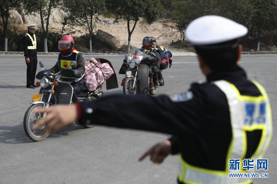 新华社照片,泉州(福建),2015年2月10日 铁骑千里返乡记 2月9日,在福建漳州,交警在指挥铁骑返乡者有序进入加油站加油休整 。一辆摩托车,几箱行李;一件雨衣,半身泥泞。每逢春节前夕,成千上万辆摩托车,在中国用工密集型省份和相邻的欠发达省份间流动。在中国,返乡摩托大军已成为一个庞大而备受瞩目的群体。千里骑行,在这趟爱与危险并存的路途中,他们的乡愁与现实选择发生着微妙而真实的碰撞。新华社记者跟随福建晋江、石狮的江西籍打工者,拍摄报道他们的千里摩托返乡路,看到了经过黄色油菜花的返乡人浪漫一瞬,也目击了因车辆碰撞而血流满面的血腥现实;看见了沿途加油站提供的温暖而实用的爱心帮助,也目击了一家人紧紧拥抱的温情时刻。回家,这是每一个在外漂泊的人内心中最柔软而深沉的声音。新华社记者 王申 摄