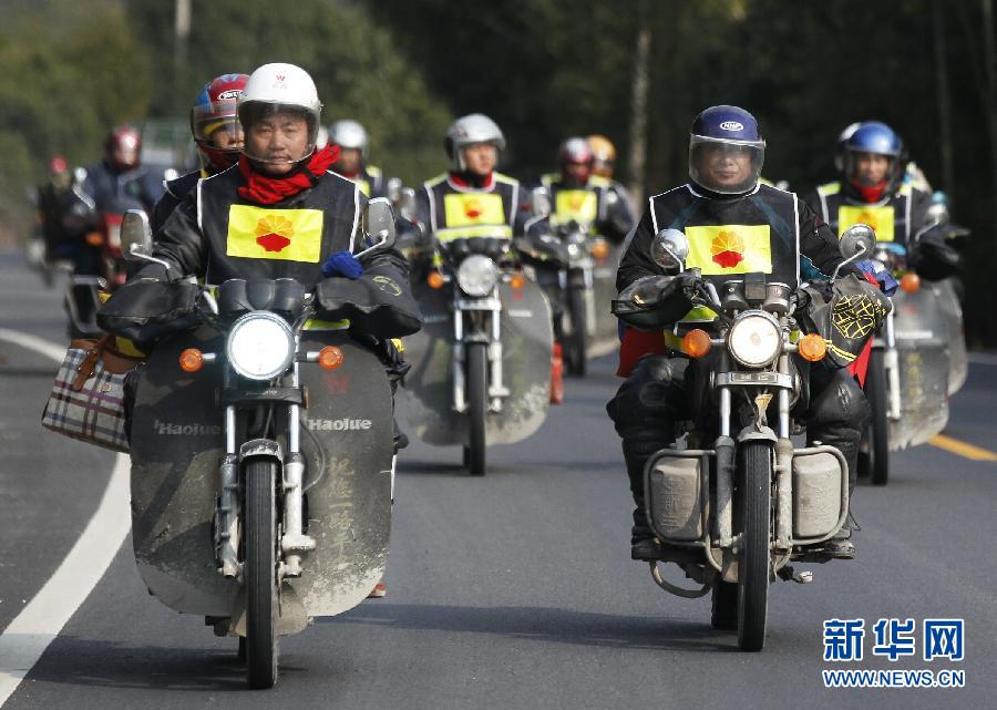 新华社照片,泉州(福建),2015年2月10日 铁骑千里返乡记 2月9日,在福建龙岩,46岁的钟复林生(前左)驾驶摩托带着妻子和老乡一起在骑行。一辆摩托车,几箱行李;一件雨衣,半身泥泞。每逢春节前夕,成千上万辆摩托车,在中国用工密集型省份和相邻的欠发达省份间流动。在中国,返乡摩托大军已成为一个庞大而备受瞩目的群体。千里骑行,在这趟爱与危险并存的路途中,他们的乡愁与现实选择发生着微妙而真实的碰撞。新华社记者跟随福建晋江、石狮的江西籍打工者,拍摄报道他们的千里摩托返乡路,看到了经过黄色油菜花的返乡人浪漫一瞬,也目击了因车辆碰撞而血流满面的血腥现实;看见了沿途加油站提供的温暖而实用的爱心帮助,也目击了一家人紧紧拥抱的温情时刻。回家,这是每一个在外漂泊的人内心中最柔软而深沉的声音。新华社记者 王申 摄