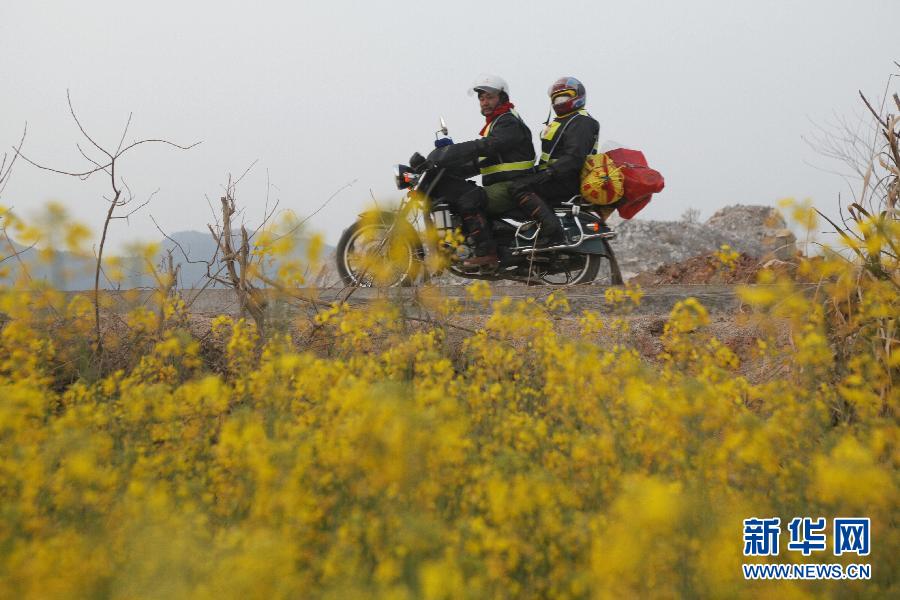 新华社照片,泉州(福建),2015年2月10日 铁骑千里返乡记 2月9日,在江西瑞金九堡乡,46岁的钟复林生驾驶摩托带着妻子经过一片油菜花地。钟复林生和妻子在泉州晋江工厂中做鞋,9日早晨6时许他们从泉州出发,12小时后到达位于江西瑞金的家里,骑行492公里。一辆摩托车,几箱行李;一件雨衣,半身泥泞。每逢春节前夕,成千上万辆摩托车,在中国用工密集型省份和相邻的欠发达省份间流动。在中国,返乡摩托大军已成为一个庞大而备受瞩目的群体。千里骑行,在这趟爱与危险并存的路途中,他们的乡愁与现实选择发生着微妙而真实的碰撞。新华社记者跟随福建晋江、石狮的江西籍打工者,拍摄报道他们的千里摩托返乡路,看到了经过黄色油菜花的返乡人浪漫一瞬,也目击了因车辆碰撞而血流满面的血腥现实;看见了沿途加油站提供的温暖而实用的爱心帮助,也目击了一家人紧紧拥抱的温情时刻。回家,这是每一个在外漂泊的人内心中最柔软而深沉的声音。新华社记者 王申 摄
