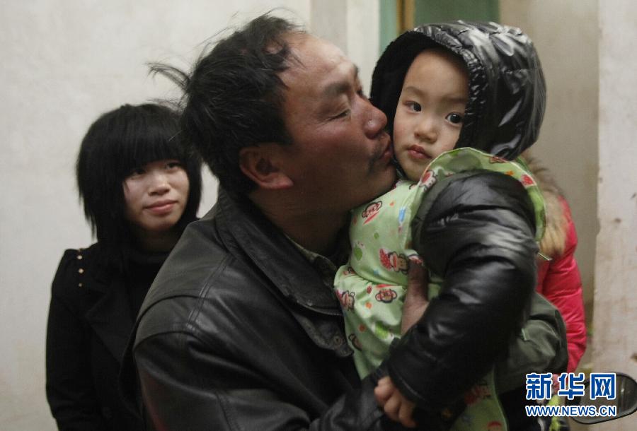 新华社照片,泉州(福建),2015年2月10日 铁骑千里返乡记 2月9日晚,在江西瑞金九堡乡,46岁的钟复林生(左二)一回家就抱起2岁的孙子亲吻。一辆摩托车,几箱行李;一件雨衣,半身泥泞。每逢春节前夕,成千上万辆摩托车,在中国用工密集型省份和相邻的欠发达省份间流动。在中国,返乡摩托大军已成为一个庞大而备受瞩目的群体。千里骑行,在这趟爱与危险并存的路途中,他们的乡愁与现实选择发生着微妙而真实的碰撞。新华社记者跟随福建晋江、石狮的江西籍打工者,拍摄报道他们的千里摩托返乡路,看到了经过黄色油菜花的返乡人浪漫一瞬,也目击了因车辆碰撞而血流满面的血腥现实;看见了沿途加油站提供的温暖而实用的爱心帮助,也目击了一家人紧紧拥抱的温情时刻。回家,这是每一个在外漂泊的人内心中最柔软而深沉的声音。新华社记者 王申 摄