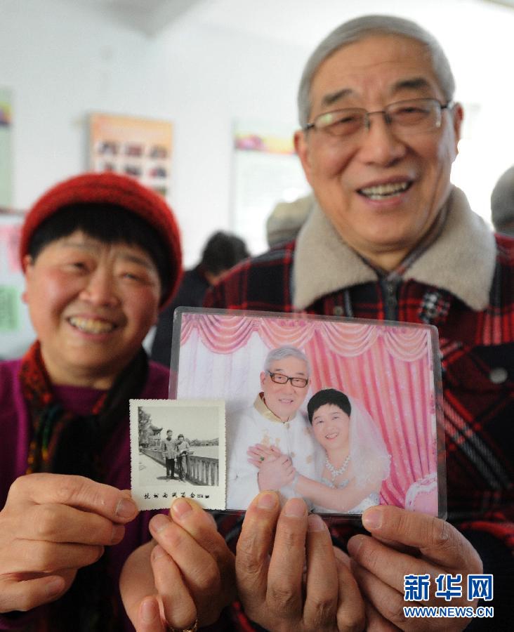 2月10日,一对夫妇在展示当年恋爱时的合影(前左)和现在补拍的婚纱照。当日,江苏省苏州工业园区东方社区举行了一场“晒甜蜜·迎新春”主题活动,来自社区的20对老年夫妇“晒”出年轻时各自的恋爱照、结婚照以及现在补拍的婚纱照,在回味甜蜜爱情的同时,喜迎羊年新春的到来。新华社发(杭兴微 摄)