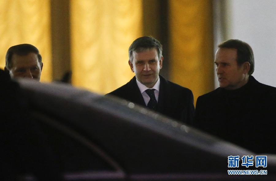 2月10日,在白俄罗斯首都明斯克,乌克兰代表、前总统库奇马(左)、俄罗斯驻乌克兰大使祖拉博夫(中)和乌政治组织“乌克兰选择”社会运动领导人梅德韦丘克在会议结束后离开会场。