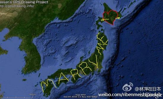 据微博网友“林萍在日本”爆料,有一位东京男子高桥靖为向女友求婚,在31岁生日这天开始出发,花了半年的时间,使用GPS定位,用徒步的方式走遍日本全国各地,在日本地图上写下“MARRY ME”,并附上一箭穿心的图像,被网友号称是“世纪最强的告白”。