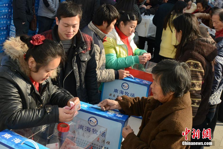2月10日,福建福州市华林路海都大厦门口,闻讯前来买南海“爱国鱼”的市民络绎不绝。“爱国鱼”大多是海胆鱼,来自南海美济礁,是退休教授林载亮领着一群平潭人养殖的。南海美济礁归属中国最南端的县市——海南省三沙市管辖,距离三亚直线距离1000多公里,是一个椭圆形的珊瑚环礁,战略位置极其重要。林载亮是福建平潭人,曾担任过大学教授,是国务院特别津贴专家,退休前担任海南省水产局副局长。2007年起,他带领3名族亲和9名平潭渔民来到美济礁养殖开发,为的是捍卫南海主权,所以他养殖的鱼被称作“爱国鱼”。林载亮带领着平潭渔民,在春节前夕把“爱国鱼”运回福州来卖,已经连续三年了。1500箱、共7500多斤的“爱国鱼”不到两个小时就卖光了,除了福州市民外,还有人是闻讯一大早从连江、闽侯等地赶来购买的。中新社发 刘可耕 摄