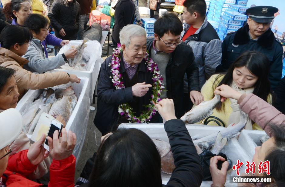 2月10日,福建福州市华林路海都大厦门口,闻讯前来买南海“爱国鱼”的市民络绎不绝。“爱国鱼”大多是海胆鱼,来自南海美济礁,是退休教授林载亮领着一群平潭人养殖的。南海美济礁归属中国最南端的县市——海南省三沙市管辖,距离三亚直线距离1000多公里,是一个椭圆形的珊瑚环礁,战略位置极其重要。林载亮是福建平潭人,曾担任过大学教授,是国务院特别津贴专家,退休前担任海南省水产局副局长。2007年起,他带领3名族亲和9名平潭渔民来到美济礁养殖开发,为的是捍卫南海主权,所以他养殖的鱼被称作“爱国鱼”。林载亮带领着平潭渔民,在春节前夕把“爱国鱼”运回福州来卖,已经连续三年了。1500箱、共7500多斤的“爱国鱼”不到两个小时就卖光了,除了福州市民外,还有人是闻讯一大早从连江、闽侯等地赶来购买的。图为林载亮(图中带花环者)亲自向市民分享“爱国鱼”的吃法。中新社发 刘可耕 摄