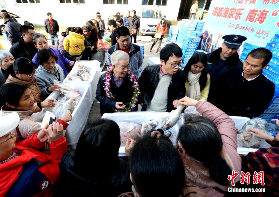 2月10日,福建福州市华林路海都大厦门口,闻讯前来买南海“爱国鱼”的市民络绎不绝。“爱国鱼”大多是海胆鱼,来自南海美济礁,是退休教授林载亮领着一群平潭人养殖的。南海美济礁归属中国最南端的县市——海南省三沙市管辖,距离三亚直线距离1000多公里,是一个椭圆形的珊瑚环礁,战略位置极其重要。林载亮是福建平潭人,曾担任过大学教授,是国务院特别津贴专家,退休前担任海南省水产局副局长。2007年起,他带领3名族亲和9名平潭渔民来到美济礁养殖开发,为的是捍卫南海主权,所以他养殖的鱼被称作“爱国鱼”。林载亮带领着平潭渔民,在春节前夕把“爱国鱼”运回福州来卖,已经连续三年了。1500箱、共7500多斤的“爱国鱼”不到两个小时就卖光了,除了福州市民外,还有人是闻讯一大早从连江、闽侯等地赶来购买的。中新社发 刘可耕 摄