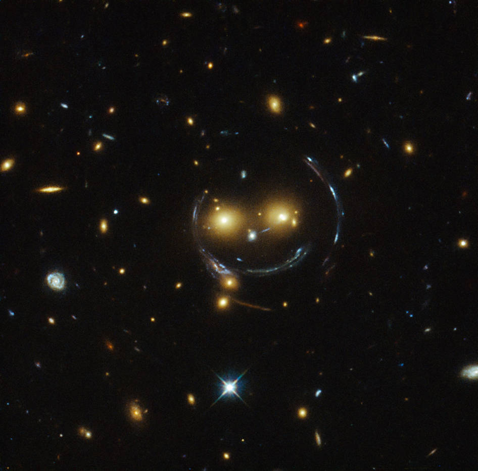 照片上可以清晰地辨认出两只橙色大“眼睛”和一个按钮般的白色“鼻子”。照片配发的文字说:“就这张‘笑脸’而言,那两只眼睛其实是非常明亮的星系,而充满笑意的嘴唇实际上是由强‘引力透镜’效应造成的光弧。”
