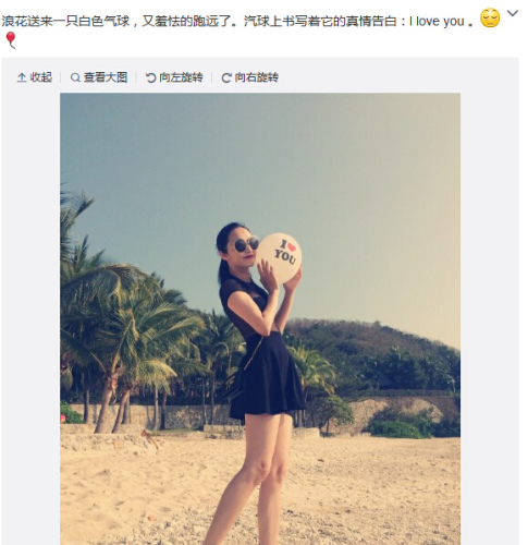 今天晚上,姚晨在微博中晒出了在海边度假的美照,并写道:“浪花送来一只白色气球,又羞怯的跑远了。气球上书写着它的真情告白:I love you ”。照片中,姚晨穿着黑色短裙,以一副黑色墨镜遮面,一双大长腿在太阳下非常抢眼。粉丝看后表示:“当妈后美出了新高度”,也有网友开玩笑称:“有个会拍照的老公就是好”。