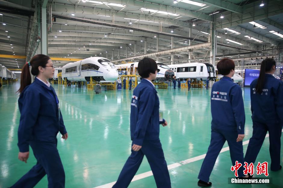 2月11日,一队女工在中国北车唐山轨道客车有限责任公司生产车间中。在如今的中国春运期间,高铁以其高速、稳定、边界、高密度发挥着其他交通工具所不可替代的运输能力,在2014年中国北车出口成交额30亿美元,比2013年增加68.6%。 中新社发 杨可佳 摄