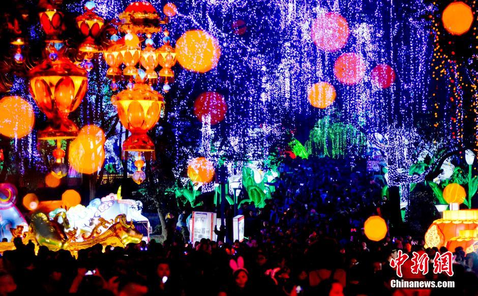 2月11日,第21届自贡国际恐龙灯会经贸交易会在自贡彩灯公园举行。本届灯会灯组制作中大量运用现代技术和节能光源,灯组整体用电负荷1700KW,比去年有所下降;园外灯饰保留了去年的优秀作品,废旧利用,修复如新,有效地降低了制作成本。中新社发 陆欣 摄