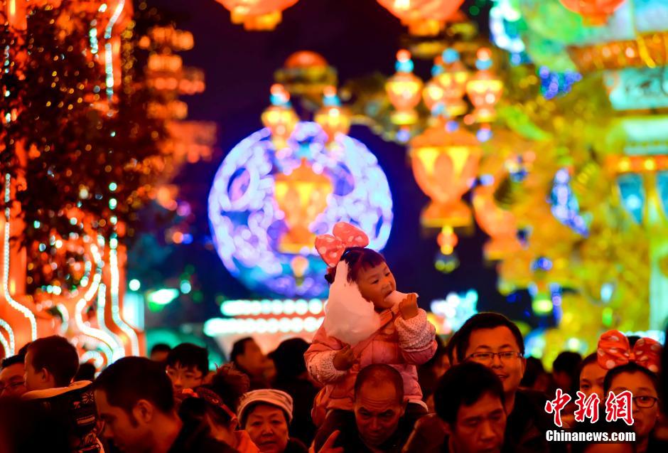 2月11日,第21届自贡国际恐龙灯会经贸交易会在自贡彩灯公园举行。本届灯会灯组制作中大量运用现代技术和节能光源,灯组整体用电负荷1700KW,比去年有所下降;园外灯饰保留了去年的优秀作品,废旧利用,修复如新,有效地降低了制作成本。中新社发 陆欣 摄