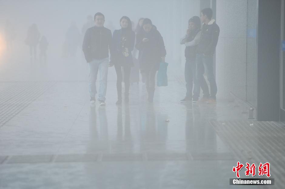 广西南宁展现“朦胧美”行人穿梭迷雾之中
