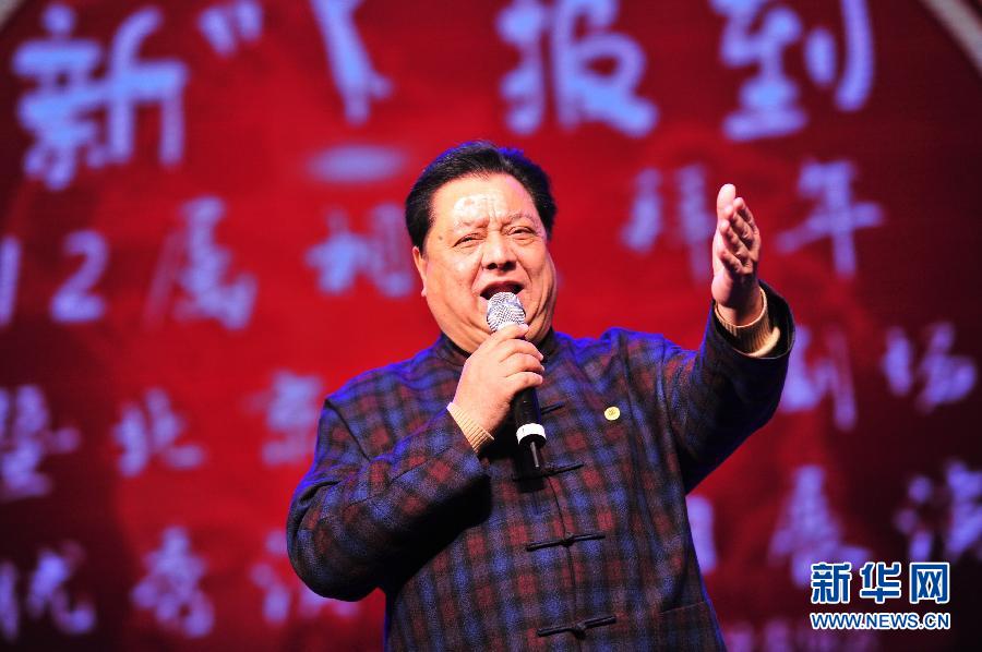 2月11日,在北京民族文化宫大剧院,著名相声演员李金斗为演出报幕。新华社记者李任滋摄