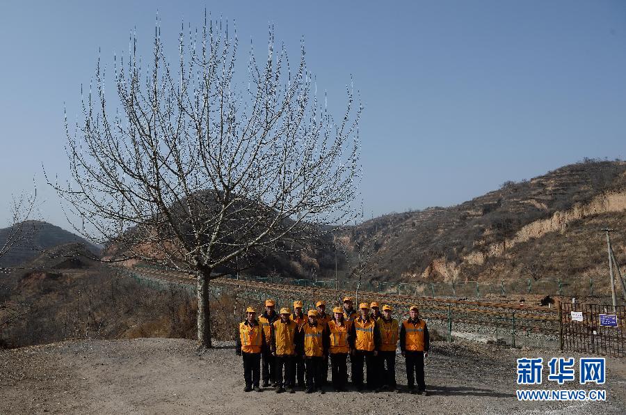 乔子玄工区的所有工作人员在工作的铁道线路旁合影,44年前第一批工区养路人栽种的小树苗已经长成大树(2月11日摄)。新华社记者 刘潇摄