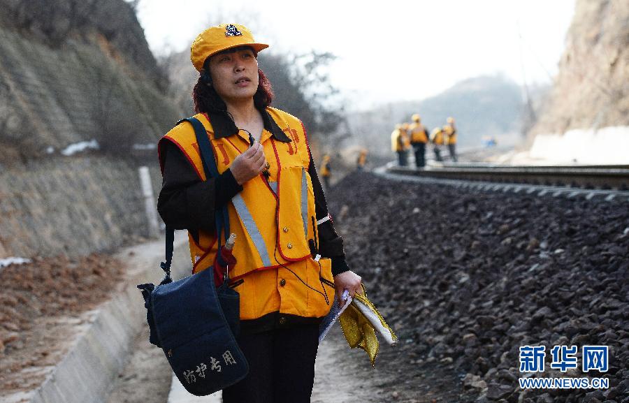 防护员赵海燕在其他工人作业时每三到五分钟与车站联系机车通过情况,对工人安全进行防护。作为工区唯一的女职工,也是在工区时间最长的职工,赵海燕身兼防护员、卫生员、厨师等多项工作,27年里有25个春节在工区度过(2月11日摄)。新华社记者 刘潇摄
