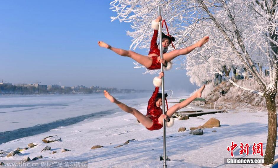 2015年2月11日上午,在吉林省吉林市松花江畔小雾凇岛上,几名江城女孩儿身穿背心短裤在雾凇美景前挑战冰雪极限秀起雾凇钢管舞,惊呆了众多游客。图片来源:东方IC 版权作品 请勿转载