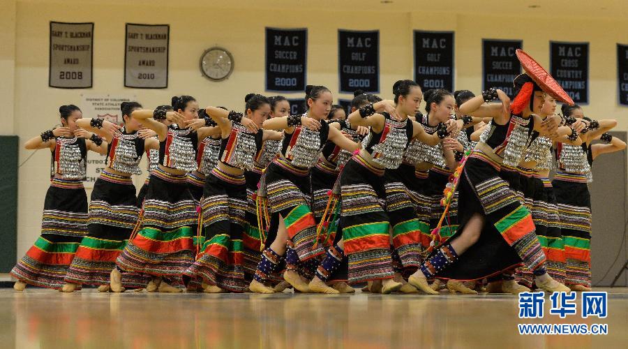 2月11日,在美国首都华盛顿,中国人民大学附属中学艺术团的学生们表演舞蹈。当晚,中国人民大学附属中学艺术团在美国乔治城中学举行“欢乐春节”演出,受到现场观众热烈欢迎。 新华社记者鲍丹丹摄