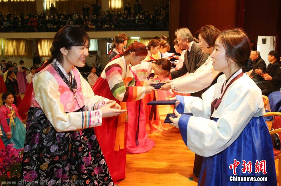 当地时间2015年2月12日,韩国首尔,女子高中的毕业生们身着传统服装参加成年礼。图片来源:东方ic 版权作品 请勿转载
