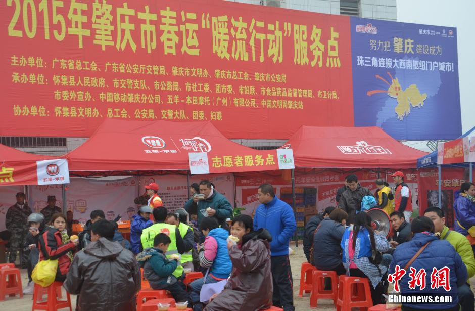 2月12日,广东S349线怀城“暖流行动”为广西、湖南、贵州等地回乡过年的春运“铁流”大军提供服务,许多“铁流”“骑手”凌晨2点就从珠三角务工地出发返乡。图为怀城“暖流行动”现场。中新社发 黄耀辉 摄