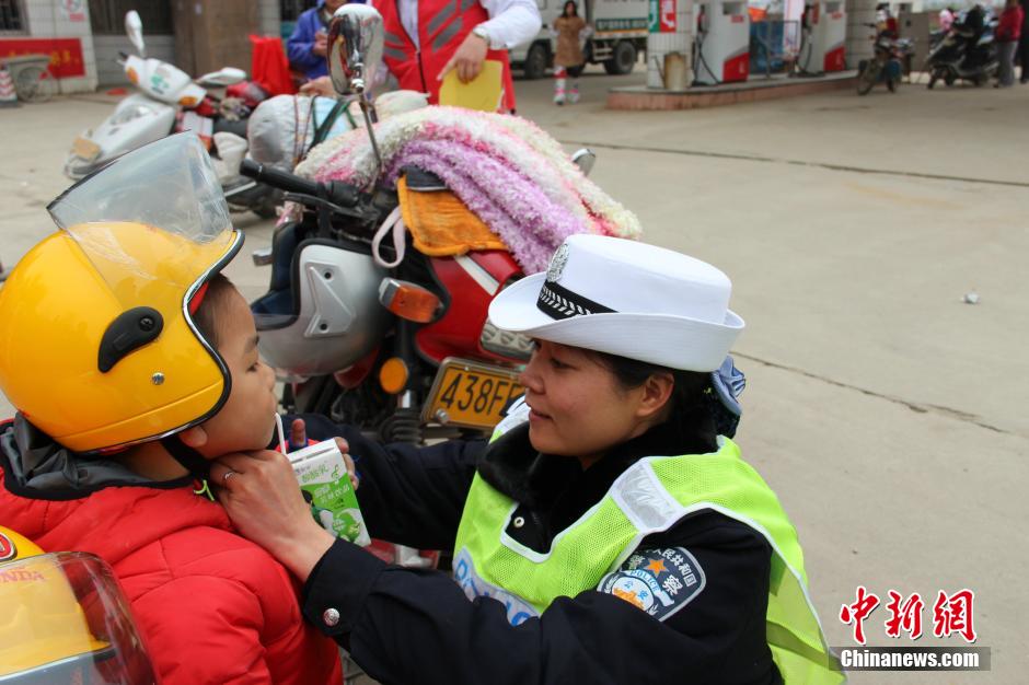 春节临近,地处广西、广东、湖南三省交界处的广西贺州市迎来农民工骑乘摩托队返乡的高峰。为减缓铁骑大军的疲劳,减少交通事故的发生,贺州市交警支队平桂大队民警在国道207线,贺州大道入口旁中石化加油站长途摩托车爱心服务站内忙碌起来,为返乡摩托车队伍准备好了热茶、泡面、安全帽等物品。图为交警给随父母返乡的小朋友赠送和佩戴安全帽。甘勇 摄