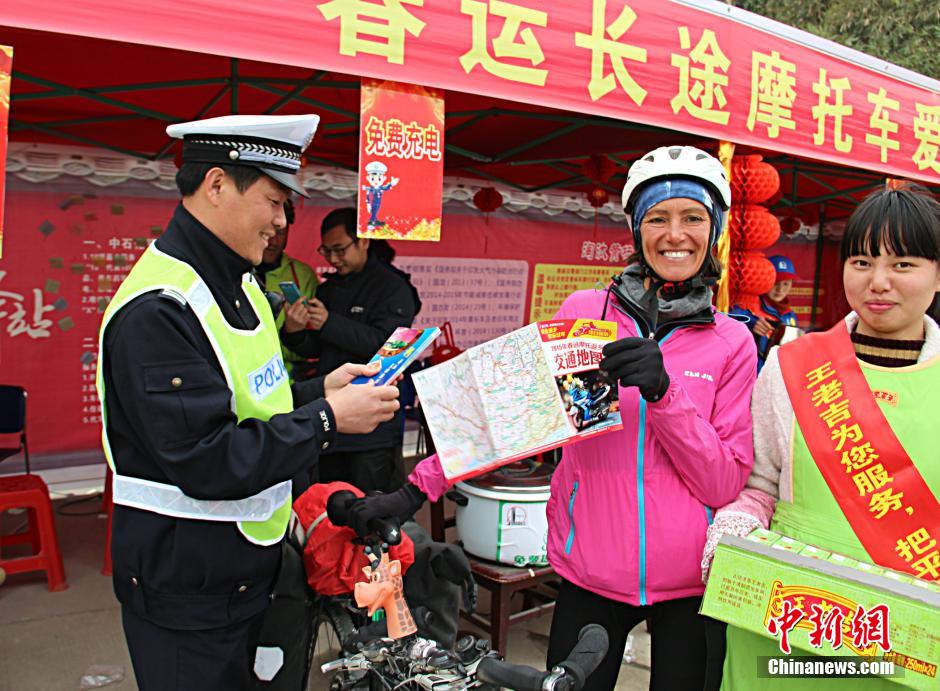 春节临近,地处广西、广东、湖南三省交界处的广西贺州市迎来农民工骑乘摩托队返乡的高峰。为减缓铁骑大军的疲劳,减少交通事故的发生,贺州市交警支队平桂大队民警在国道207线,贺州大道入口旁中石化加油站长途摩托车爱心服务站内忙碌起来,为返乡摩托车队伍准备好了热茶、泡面、安全帽等物品。图为外国友人喜获民警赠送的中国交通地图。卢芸娇 摄