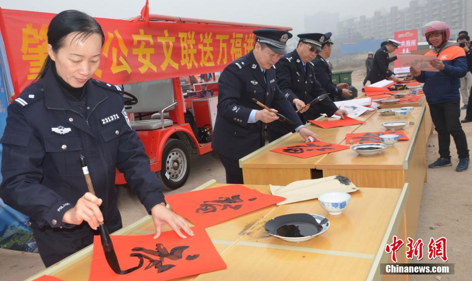 2月12日,广东S349线“暖流行动”怀集县交警为广西、湖南、贵州等地回乡过年的春运“铁流”大军服务,许多“铁流”“骑手”凌晨2点就从珠三角务工地出发返乡。图为肇庆市公安文联组织“公安书法家”现场为“骑手”送“福”。中新社发 黄耀辉 摄