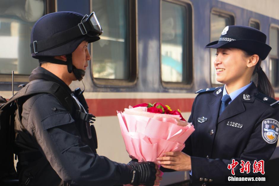 2月12日下午,铁路春运正在如火如荼进行,南宁铁路公安局柳州公安处90后特警段晋,在广西柳州火车站与妻子告别。妻子莱雯龄是其同事,新婚不久的两人,因为忙春运很难相聚在一起。当天段晋要到外地出差执勤,在离别前将特意准备好的鲜花送给莱雯龄,为她献上提前的“情人节”祝福,两人在站台上深情地相拥告别。图为段晋在出差前为妻子献上玫瑰花,提前庆祝情人节。林馨 摄