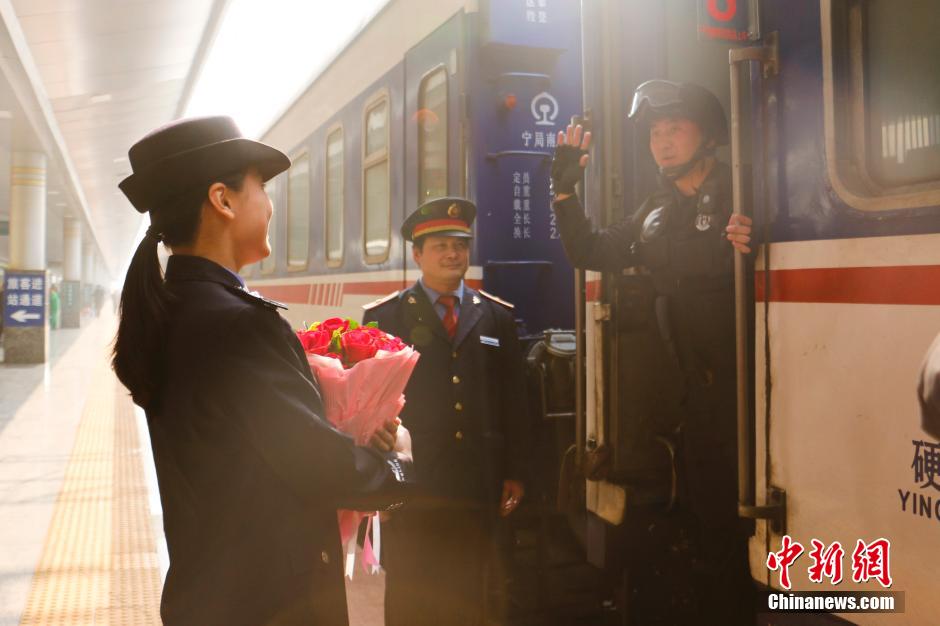 2月12日下午,铁路春运正在如火如荼进行,南宁铁路公安局柳州公安处90后特警段晋,在广西柳州火车站与妻子告别。妻子莱雯龄是其同事,新婚不久的两人,因为忙春运很难相聚在一起。当天段晋要到外地出差执勤,在离别前将特意准备好的鲜花送给莱雯龄,为她献上提前的“情人节”祝福,两人在站台上深情地相拥告别。图为段晋在出差前为妻子献上玫瑰花,提前庆祝情人节。林馨 摄