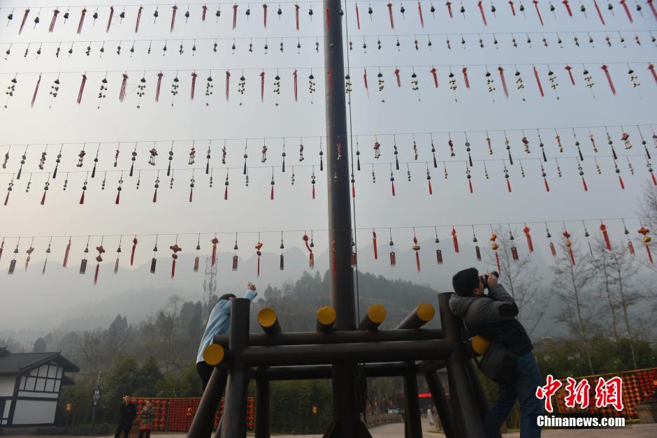 2月12日,四川广元剑门关景区举行的“新春风铃展”吸引了各地游客。此次风铃展在剑门关景区多处分别进行布置,数万个风铃在风中摇摇晃晃发出清脆悦耳的铃音,场面震撼。从古至今,风铃被视为思念、祈福、吉祥、祝愿等含义。剑门关与风铃也有着不解渊源,中国名曲《剑阁闻铃》就曾描写了唐玄宗避安史之乱,唐明皇在马嵬坡赐死杨玉环以后,继续入蜀,西行途中夜宿剑阁,在冷雨凄风伴随叮咚作响的檐铃声中,思念惨死马嵬坡的爱妃杨玉环,一夜未眠到天明的情景。张浪 摄