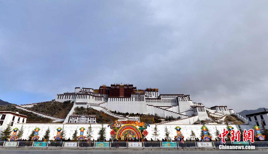 即将到来的的农历春节和藏历新年前后相差一天。拉萨街头张灯结彩,迎接农历羊年和藏历木羊年的到来。图为2月12日,布达拉宫前摆放着象征五谷丰登的“切玛”和吉祥八宝图。李林 摄