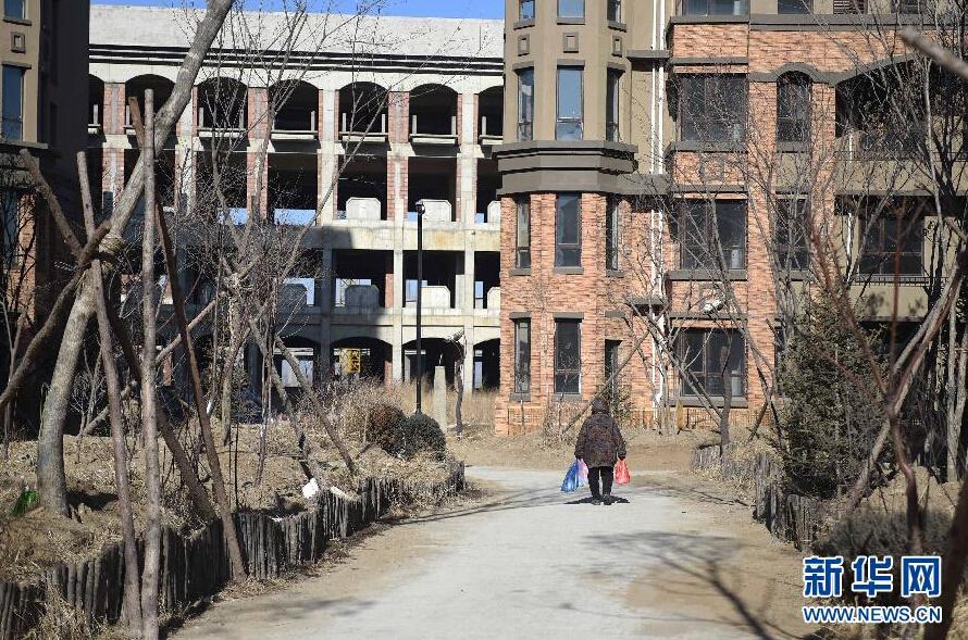 图为世外桃源小区内一位居民手提购物袋回家(2月9日摄)。温泉、农场、花园洋房……此前沈阳市辽中县“世外桃源”小区的宣传还铺天盖地。在2014年7月,物业无故撤走,开发商不见踪影,水、电临时配置,购房人“桃源梦”近乎破灭。记者调查发现,项目搁置虽是因开发商高息吸储引发资金链断裂,但让购房人梦断“桃花源”也暴露出监管不足。潘昱龙 摄 图片来源:新华网