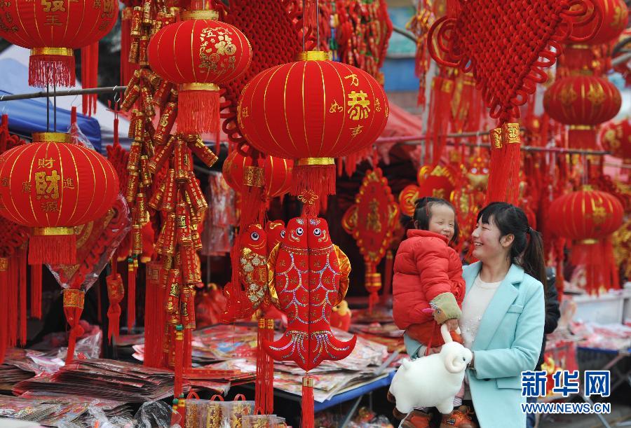 2月14日,在安徽阜阳人民路市场,一名家长带着孩子选购年货。春节临近,人们纷纷外出置办年货,各地年货市场红红火火,年味浓郁。 新华社发(卢启建 摄)
