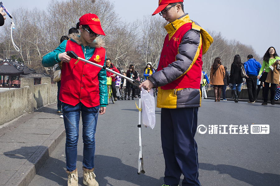 志愿者沿着西湖捡垃圾。