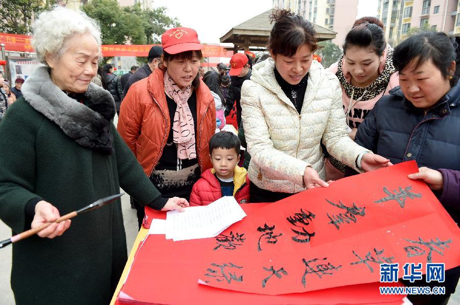 2月14日,在淝南社区迎新春小庙会上,书法爱好者在现场书写春联赠予社区居民。 2月14日,安徽省合肥市包河区淝南社区举行了一场社区迎新春小庙会,现场写春联、猜灯谜等活动吸引了不少社区居民前来“闹”新春。新华社记者 郭晨 摄