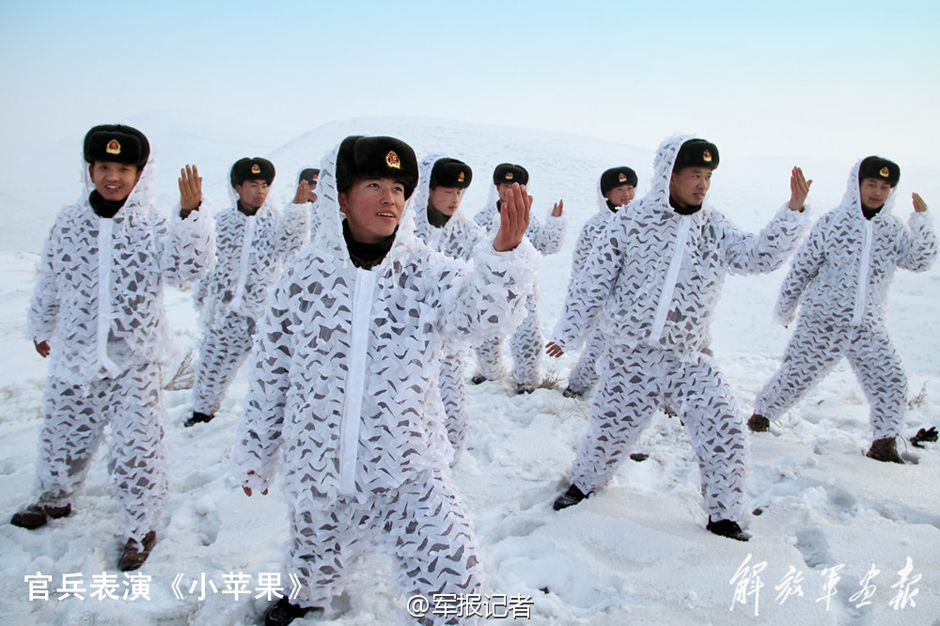 2015年1月初,解放军身穿镂空装冰天雪地跳小苹果的图片在网上热传,网友纷纷表示这样的装扮“太时尚”。图片来源:解放军报法人微博