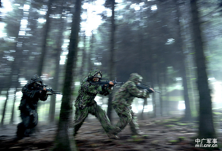 除上述各种雪地伪装服外,在西北荒漠、南国雨林以及山地丘陵等各种地形环境,解放军也都发展了与之相适应的的伪装服。图为活跃在滇西热带山岳丛林的解放军侦察兵,深绿色迷彩吉利服与周围环境极其相似。图片来源:央广网