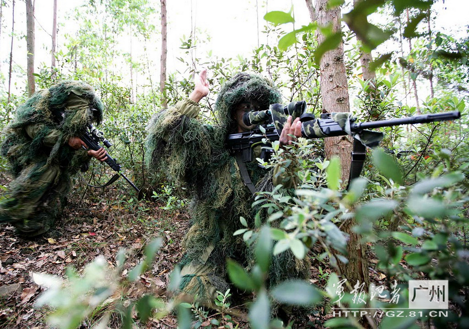 图为在广州军区某战术训练基地,解放军狙击手身着厚密的吉利服协同作战。图片来源:军报记者网