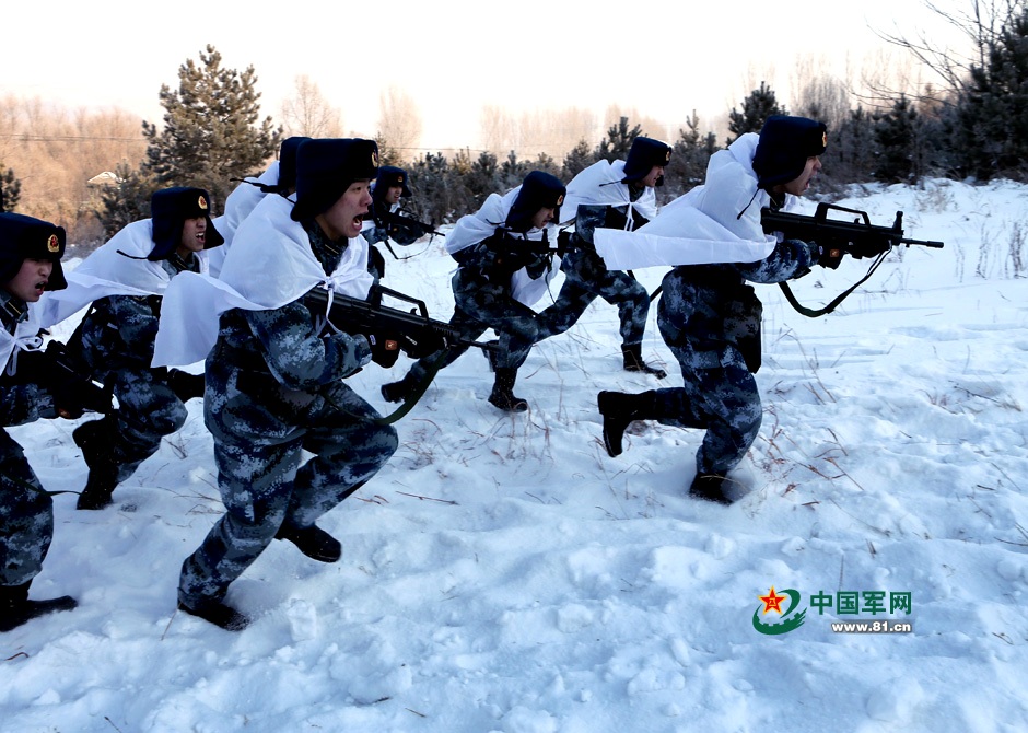 当然,许多情况下,“白床单”的伪装效果并不明显。包裹的太严会阻碍动作的施展,简单的披在身上,床单随风飘又降低了伪装效果。而如果太小,像马甲一样披在身上,就难怪被网友吐槽了。图为解放军飞行学员穿越林海雪原,这里的“白床单”更多的是象征意义了。图片来源:中国军网 曹占礼摄