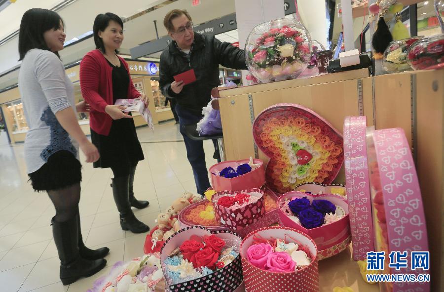 2月13日, 在加拿大温哥华, 商场店铺展示不同种类的情人节花盒供人选购。 为迎接情人节来临,温哥华的商店推出不同种类的节日礼品,以吸引民众选购。 新华社发(梁森摄)