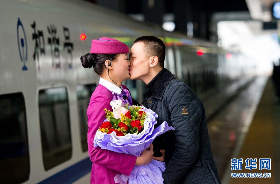 当日,在重庆火车北站的站台上,两个成都铁路局重庆客运段的列车长在等待和别离中上演了一幕春运路上的温馨故事。31岁的段鸿飞和妻子谢寒梅都是重庆客运段的列车长,一个在上海方向的车队、一个在福州方向的动车车队。因为工作关系,两人自恋爱开始5年间从没能聚在一起过一次情人节。今年2月14日情人节前恰逢段鸿飞轮休,可是妻子却要参加D2228次福州方向动车组的春运任务,为了给妻子一个惊喜,小段偷偷买了玫瑰和巧克力来到车站,一直等候在妻子所在班组完成发车前的全部工作,在登车离开前给妻子送上鲜花、礼物和情人节前的温馨一吻。新华社记者 刘潺 摄
