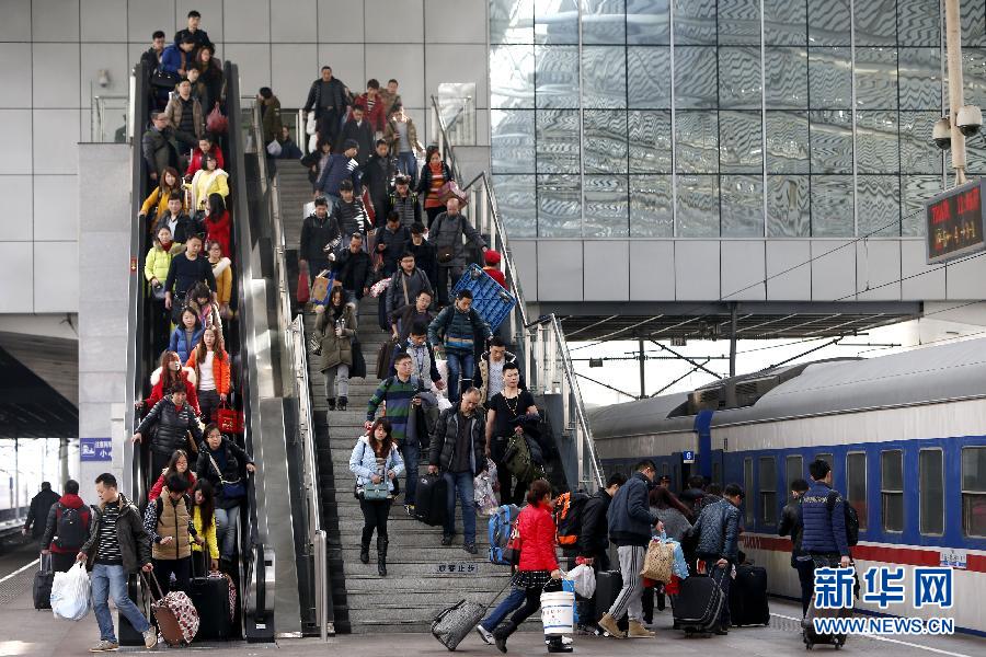 2月14日,上海火车站旅客准备上车。当日,上海铁路迎来春运客流高峰,预计发送旅客40万人次。 新华社记者 丁汀 摄