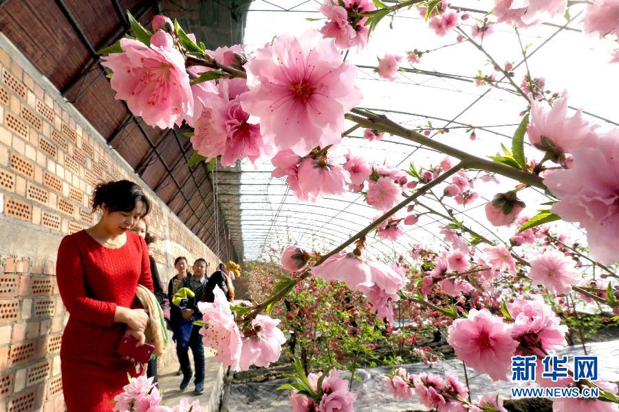 2月14日,游客在新疆哈密柳树泉农场现代农业园区的大棚桃基地观赏桃花。当日,位于新疆哈密市的新疆生产建设兵团第十三师柳树泉农场举行“赏桃花品草莓”旅游文化节,大棚桃花迎春绽放,草莓陆续成熟,吸引了许多游客前来赏花品果。 新华社发(蔡增乐 摄)