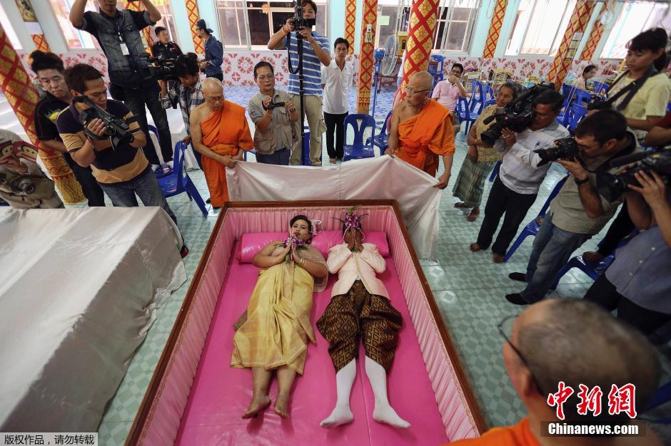 泰国新婚夫妇情人节办婚礼 躺粉色棺材求好运