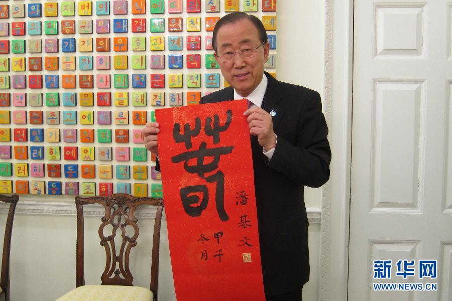 2月13日,在纽约联合国秘书长官邸,联合国秘书长潘基文展示书写的“春”字。应中国文化部邀请,联合国秘书长潘基文13日在纽约官邸为“欢乐春节”全球活动题写了一个“春”字。“欢乐春节”是一项旨在全球推广中国文化、促进中外文化交流的品牌活动。新华社发(张俊摄)