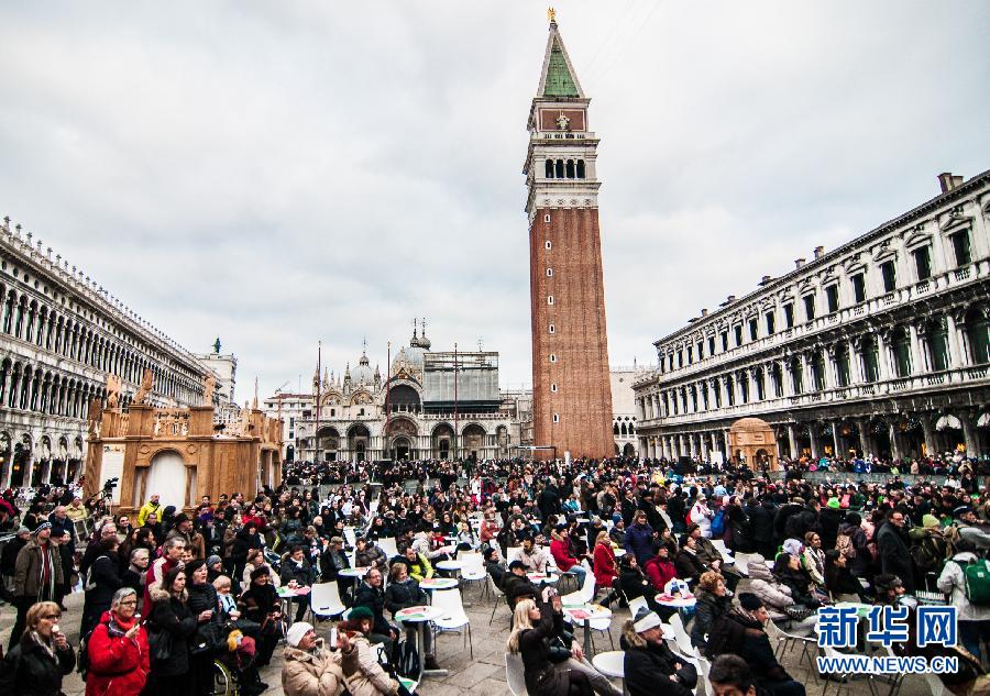 2月13日,在意大利威尼斯,游客聚集在狂欢节中心区圣马可广场。 新华社发