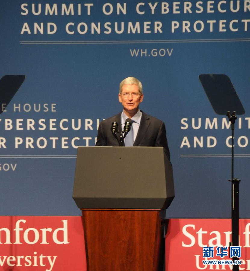 2月13日,在美国加利福尼亚州北部硅谷地区的斯坦福大学,苹果公司首席执行官蒂姆·库克在峰会上发表讲话。当日,美国总统奥巴马出席了位于硅谷的斯坦福大学“关于网络安全与消费者保护的白宫峰会”。他呼吁私营企业加强与美国政府在网络安全领域的合作,通过信息分享等方式共同防止网络安全威胁。但对这一提议,一些企业也表示了有关用户隐私方面的顾虑。新华社记者马丹摄